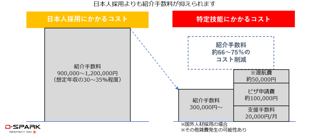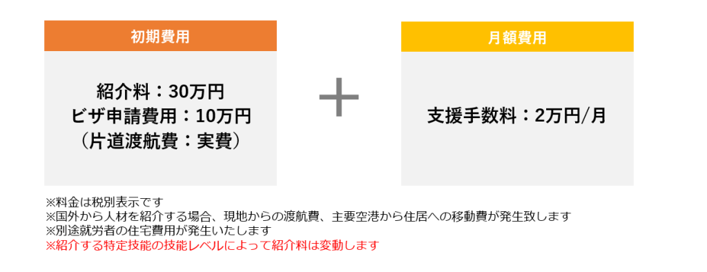 求人広告と違い採用決定後の成果報酬と支援手数料のみで労働力を確保できます。 採用までは勿論採用後の様々な諸手続きもすべて一括サポートいたします。 現在様々な特定技能外国人受け入れについての補助金があり、これらをうまく活用しさらに大幅なコストカットを図り優秀な技能性を即戦力として採用が可能です。